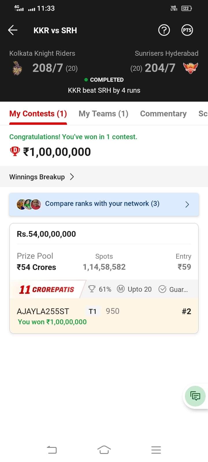 बिलासपुर जिला के अजय ने ऑनलाइन फैंटेसी ऐप ड्रीम्स 11 में एक करोड़ का इनाम जीता है। आईपीएल में पिछले कल हुए कोलकाता नाइट राइडर्स और हैदराबाद सन राइजर्स के बीच हुए मैच में अजय की फैंटसी टीम ने 950 अंकों के साथ दूसरा स्थान हासिल किया और उसको एक करोड़ रुपए इनाम मिला। अजय , वन विभाग बिलासपुर में मल्टी टास्क वर्कर के रूप में कार्यरत हैं।