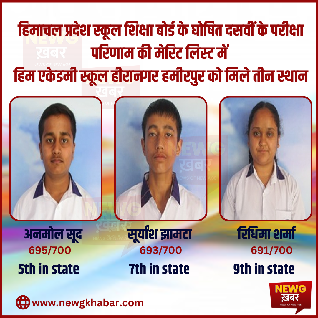 हिमाचल प्रदेश स्कूल शिक्षा बोर्ड द्वारा घोषित दसवीं कक्षा के परिणाम में हिमाचल के अग्रणी स्कूल हिम आदमी पब्लिक स्कूल हीरानगर ने अपनी परंपरा को जारी रखते हुए एक बार फिर से अपना दबदबा बरकरार रखा है। प्रदेश शिक्षा बोर्ड द्वारा जारी मेरिट लिस्ट के अनुसार हिम अकादमी स्कूल के छात्र अनमोल सूद ने 700 में से 695 अंक लेकर प्रदेश में पांचवा स्थान हासिल किया है। सूर्यांश झामटा ने 700 में से 693 अंक लेकर सातवां वहीं रिद्धिमा शर्मा ने 700 में से 691 अंक लेकर प्रदेश में नौवां स्थान हासिल किया है। गौरतलब है कि हिम एकेडमी पब्लिक स्कूल, मेरिट लिस्ट में अब तक 150 से जायदा मेरिट लेने का गौरव प्राप्त कर चुका है।